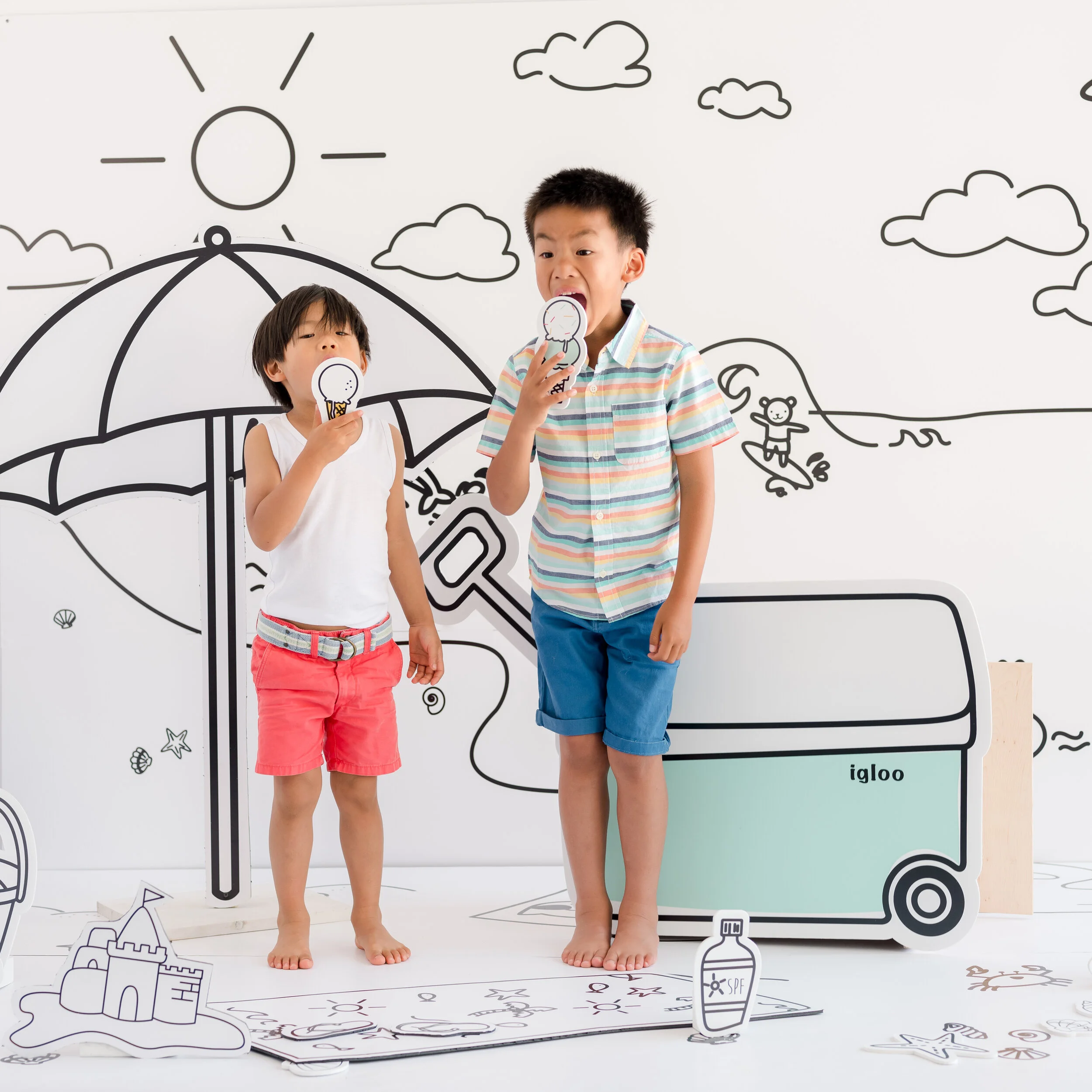 One advantage of our mostly black and white hand-drawn backdrops is that they really leave the door wide open in terms of color options. It will be virtually impossible to wear a color that clashes with the background! That being said, it is summertime, so we recommend choosing clothing in fun colors that are reminiscent of a day spent at the boardwalk, like a punchy coral, aqua, lime green, and sunshine yellow to name a few. As you can see with the images in this post, these hues also play well with the pops of color we’ve chosen for our props.